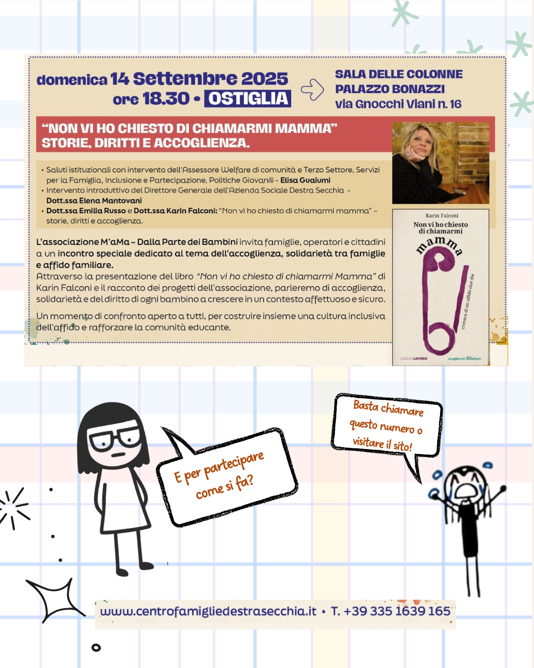 Domenica 14 settembre, alle ore 18:30, durante la presentazione di Non vi ho chiesto di chiamarmi mamma ci concederemo un momento di confronto aperto a tutti per costruire insieme una cultura inclusiva dell’affido e rafforzare la comunità educante.