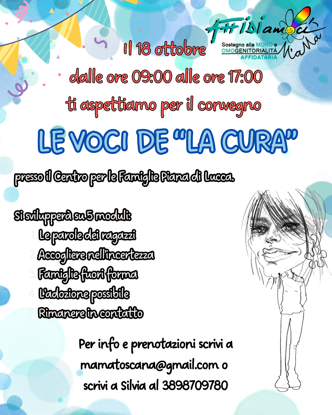 Succede davvero: il 18 ottobre, dalle 09:00 alle 17:00, al Centro per le Famiglie Piana di Lucca, con il convegno Le voci de La Cura. Non sarà il solito convegno: sul palco saliranno famiglie affidatarie e adottive e ragazzi. Saranno loro i relatori, con storie, emozioni e domande. Accanto, in dialogo costante, ci saranno professionisti – psicologi, avvocati, assistenti sociali – perché vita reale e competenza tecnica si incontrino sul serio (senza traduttori simultanei tra teoria e pratica).