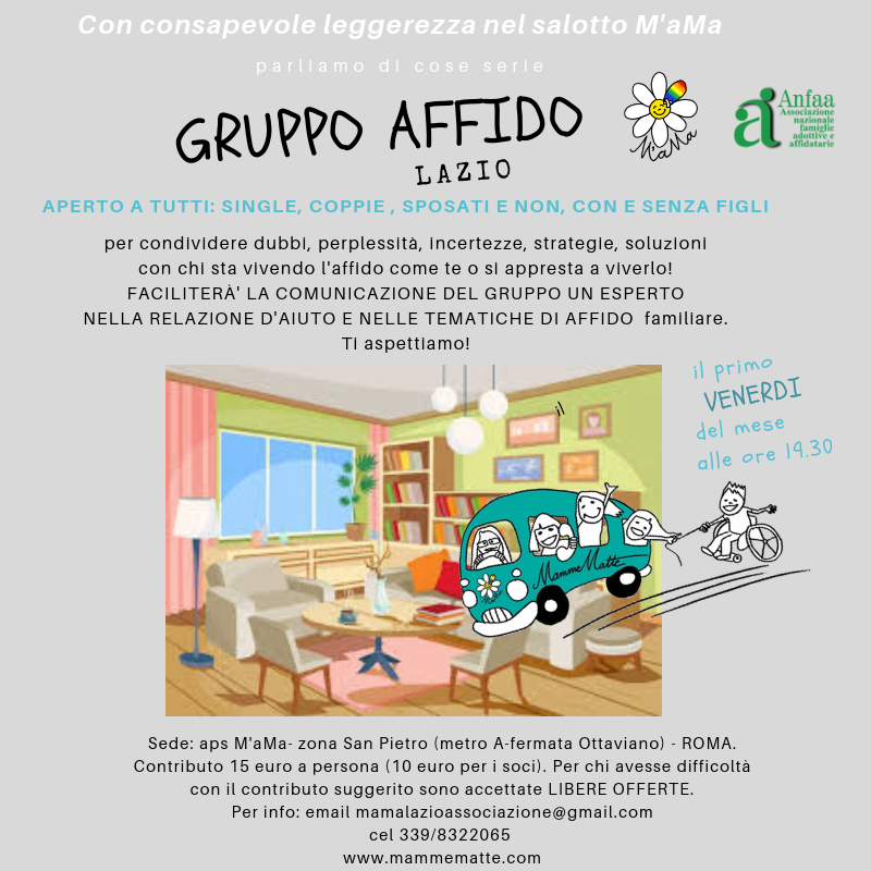 Continuano gli appuntamenti, ogni primo Venerdì del mese, con il GRUPPO Affido familiare organizzato dalle associazioni M’aMa-Dalla Parte dei Bambini e ANFAA (sezione Roma) a sostegno di TUTTI COLORO CHE SONO GIA’ GENITORI AFFIDATARI O SONO IN ATTESA DI DIVENTARLO!