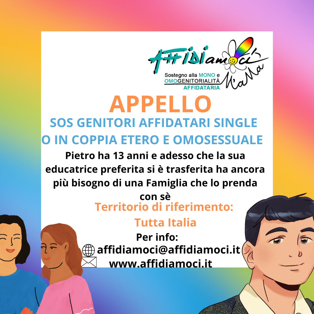 AFFIDIamoci (progetto M’aMa sulla mono e omogenitorialità affidataria) riceve mandato gratuito da Tribunali dell’intero territorio nazionale per cercare famiglie affidatarie omo e monogenitoriali per minori in attesa di famiglia (vedi APPELLI). AFFIDIamoci dopo aver raccolto, a titolo volontario, le candidature delle famiglie (opportunamente formate) interessate a presentarsi al colloquio conoscitivo in Tribunale per il singolo Appello, invia le loro autopresentazioni. Sarà il Tribunale a valutare l’idoneità dell’eventuale abbinamento con il minore. Dopo l’eventuale abbinamento con il minore AFFIDIamoci, solo se richiesto dalla famiglia, a tariffe sociali, fornirà supporto genitoriale e/o giuridico e, ove possibile, l’accompagnerà nella presentazione dell’istanza dell’adozione ai sensi dell’art.44.