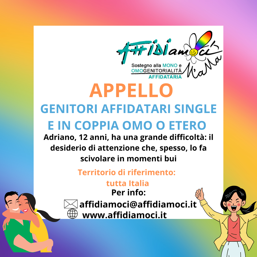 AFFIDIamoci (progetto M’aMa sulla mono e omogenitorialità affidataria) riceve mandato gratuito da Tribunali dell’intero territorio nazionale per cercare famiglie affidatarie omo e monogenitoriali per minori in attesa di famiglia (vedi APPELLI). AFFIDIamoci dopo aver raccolto, a titolo volontario, le candidature delle famiglie (opportunamente formate) interessate a presentarsi al colloquio conoscitivo in Tribunale per il singolo Appello, invia le loro autopresentazioni. Sarà il Tribunale a valutare l’idoneità dell’eventuale abbinamento con il minore. Dopo l’eventuale abbinamento con il minore AFFIDIamoci, solo se richiesto dalla famiglia, a tariffe sociali, fornirà supporto genitoriale e/o giuridico e, ove possibile, l’accompagnerà nella presentazione dell’istanza dell’adozione ai sensi dell’art.44.