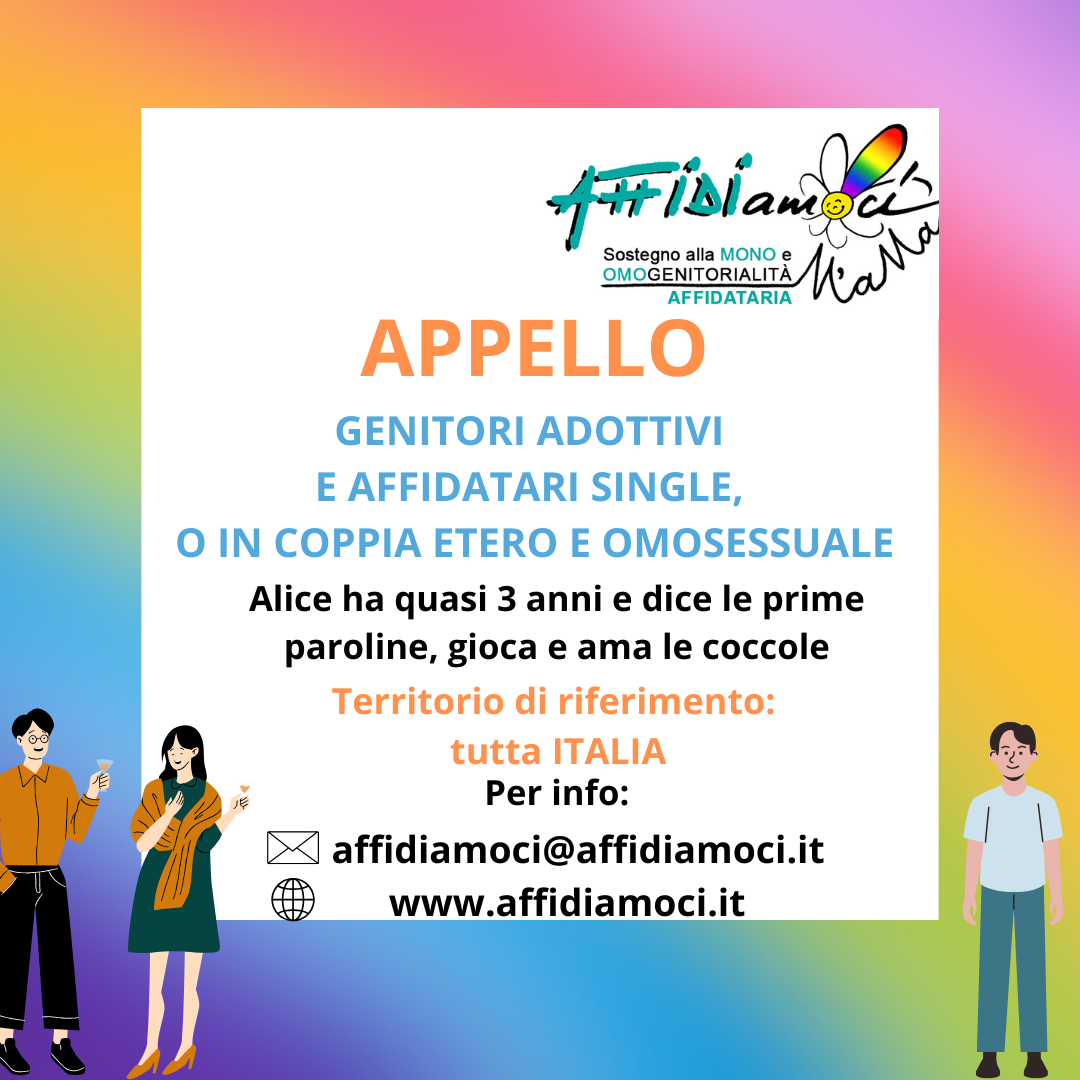 AFFIDIamoci (progetto M’aMa sulla mono e omogenitorialità affidataria) riceve mandato gratuito da Tribunali dell’intero territorio nazionale per cercare famiglie affidatarie omo e monogenitoriali per minori in attesa di famiglia (vedi APPELLI). AFFIDIamoci dopo aver raccolto, a titolo volontario, le candidature delle famiglie (opportunamente formate) interessate a presentarsi al colloquio conoscitivo in Tribunale per il singolo Appello, invia le loro autopresentazioni. Sarà il Tribunale a valutare l’idoneità dell’eventuale abbinamento con il minore. Dopo l’eventuale abbinamento con il minore AFFIDIamoci, solo se richiesto dalla famiglia, a tariffe sociali, fornirà supporto genitoriale e/o giuridico e, ove possibile, l’accompagnerà nella presentazione dell’istanza dell’adozione ai sensi dell’art.44.