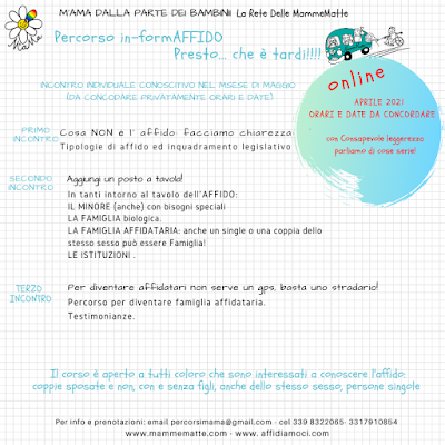 Organizzato dall’associazione M’aMa-Dalla Parte dei Bambini (La Rete delle MammeMatte) il corso (da remoto, su piattaforma gratuita Zoom) prevede, nella prima settimana di Aprile 2021, un primo incontro conoscitivo individuale di 30 minuti (giorni e orari da concordare privatamente).