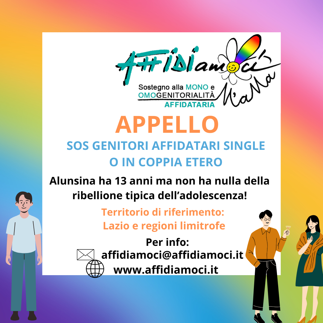 AFFIDIamoci (progetto M’aMa sulla mono e omogenitorialità affidataria) riceve mandato gratuito da Tribunali dell’intero territorio nazionale per cercare famiglie affidatarie omo e monogenitoriali per minori in attesa di famiglia (vedi APPELLI). AFFIDIamoci dopo aver raccolto, a titolo volontario, le candidature delle famiglie (opportunamente formate) interessate a presentarsi al colloquio conoscitivo in Tribunale per il singolo Appello, invia le loro autopresentazioni. Sarà il Tribunale a valutare l’idoneità dell’eventuale abbinamento con il minore. Dopo l’eventuale abbinamento con il minore AFFIDIamoci, solo se richiesto dalla famiglia, a tariffe sociali, fornirà supporto genitoriale e/o giuridico e, ove possibile, l’accompagnerà nella presentazione dell’istanza dell’adozione ai sensi dell’art.44.