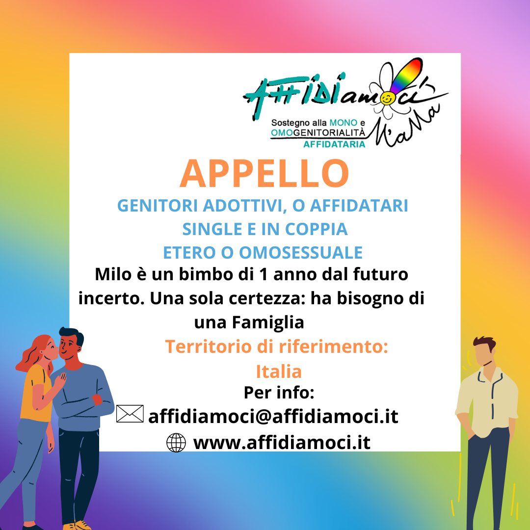 AFFIDIamoci (progetto M’aMa sulla mono e omogenitorialità affidataria) riceve mandato gratuito da Tribunali dell’intero territorio nazionale per cercare famiglie affidatarie omo e monogenitoriali per minori in attesa di famiglia (vedi APPELLI). AFFIDIamoci dopo aver raccolto, a titolo volontario, le candidature delle famiglie (opportunamente formate) interessate a presentarsi al colloquio conoscitivo in Tribunale per il singolo Appello, invia le loro autopresentazioni. Sarà il Tribunale a valutare l’idoneità dell’eventuale abbinamento con il minore. Dopo l’eventuale abbinamento con il minore AFFIDIamoci, solo se richiesto dalla famiglia, a tariffe sociali, fornirà supporto genitoriale e/o giuridico e, ove possibile, l’accompagnerà nella presentazione dell’istanza dell’adozione ai sensi dell’art.44.