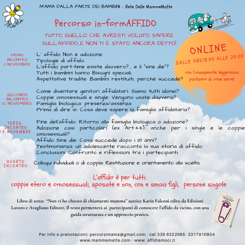 Organizzato dall’associazione M’aMa-Dalla Parte dei Bambini (La Rete delle MammeMatte) il percorso ONLINE di preparazione all’affido familiare prevede tre incontri di gruppo dalle ore 18.00 alle ore 2o.00 (martedì 11, mercoledì 12 e giovedì 13 Novembre) condotti da professionisti esperti del settore e, a fine percorso, un incontro di restituzione, individuale o di coppia, di 45 minuti (giorno e orari da concordare privatamente).
