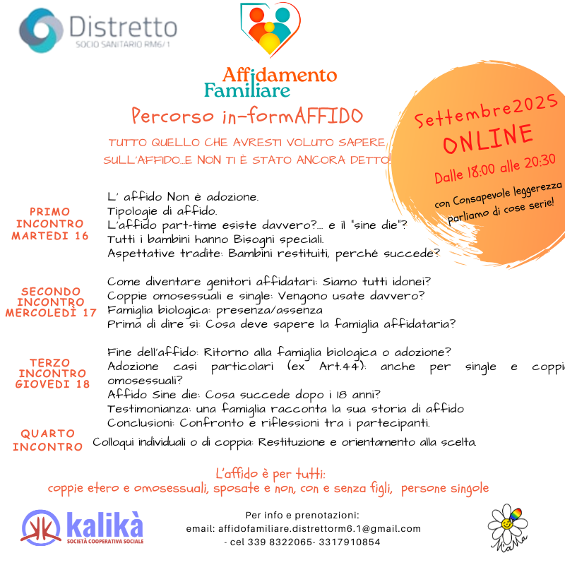 Organizzato dall’associazione M’aMa-Dalla Parte dei Bambini (La Rete delle MammeMatte), e promosso dal Distretto Sanitario RM6.1, il percorso ONLINE di preparazione all’affido familiare prevede tre incontri di gruppo dalle ore 18.00 alle ore 2o.30 (martedì 16, mercoledì 17 e giovedì 18 Settembre) condotti da professionisti esperti del settore e, a fine percorso, un incontro di restituzione, individuale o di coppia, di 45 minuti (giorno e orari da concordare privatamente).