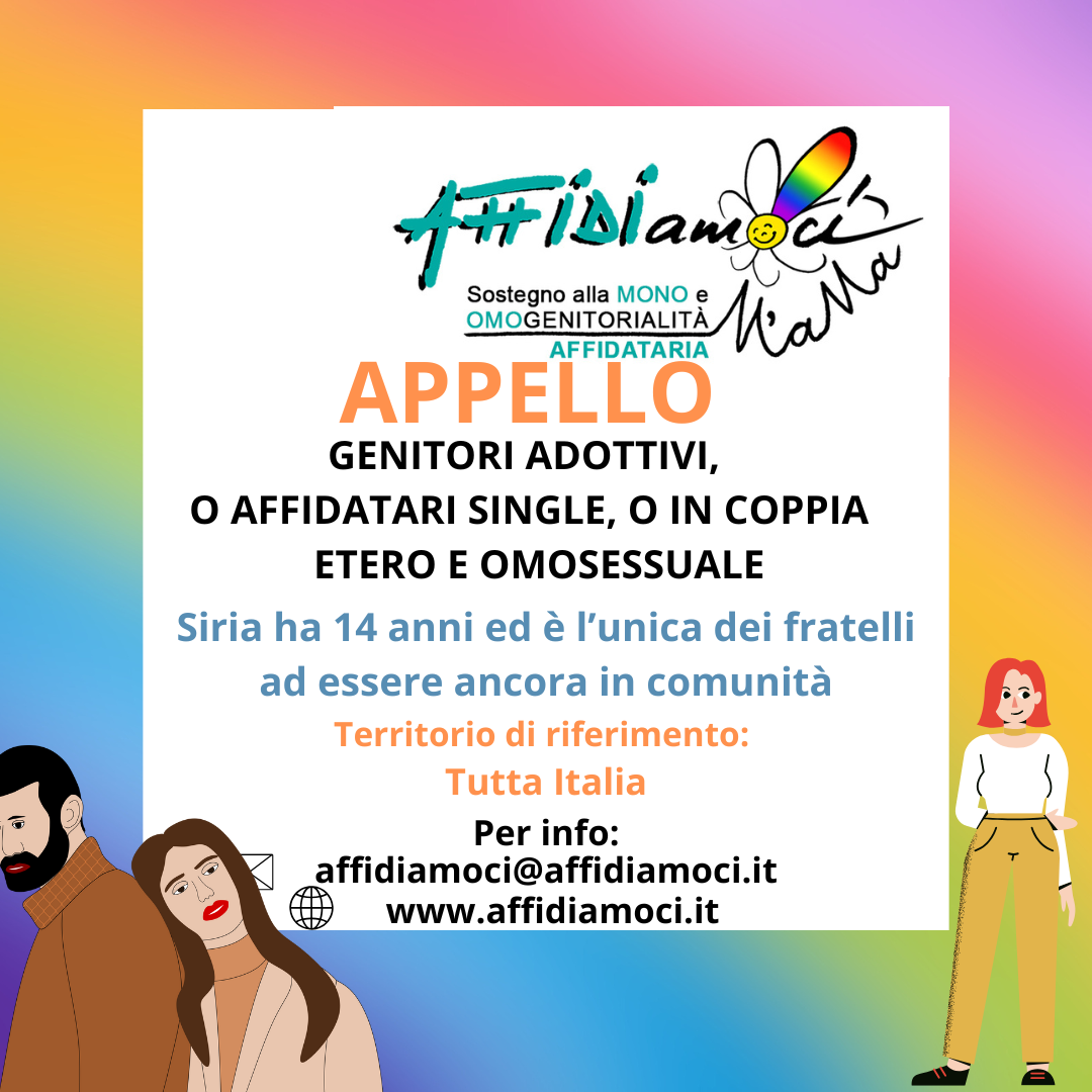 AFFIDIamoci (progetto M’aMa sulla mono e omogenitorialità affidataria) riceve mandato gratuito da Tribunali dell’intero territorio nazionale per cercare famiglie affidatarie omo e monogenitoriali per minori in attesa di famiglia (vedi APPELLI). AFFIDIamoci dopo aver raccolto, a titolo volontario, le candidature delle famiglie (opportunamente formate) interessate a presentarsi al colloquio conoscitivo in Tribunale per il singolo Appello, invia le loro autopresentazioni. Sarà il Tribunale a valutare l’idoneità dell’eventuale abbinamento con il minore. Dopo l’eventuale abbinamento con il minore AFFIDIamoci, solo se richiesto dalla famiglia, a tariffe sociali, fornirà supporto genitoriale e/o giuridico e, ove possibile, l’accompagnerà nella presentazione dell’istanza dell’adozione ai sensi dell’art.44.