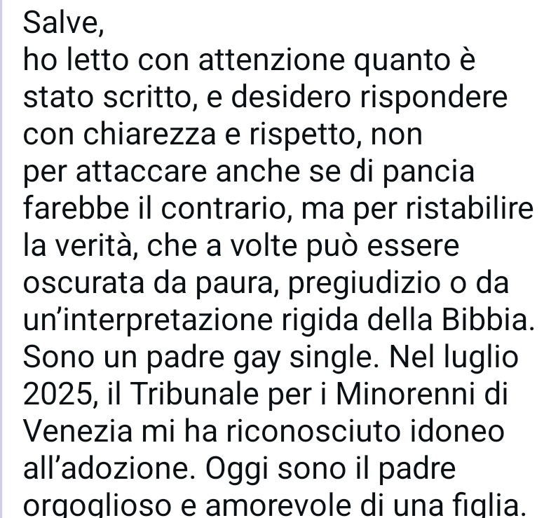 Sono un padre gay single. Nel luglio 2025, il Tribunale per i Minorenni di Venezia mi ha riconosciuto idoneo all’adozione. Oggi sono il padre orgoglioso e amorevole di una figlia. Una figlia che per troppo tempo è rimasta in una struttura, considerata non adatta da tante coppie perché non più piccola, non più facile, non perfetta secondo certi criteri. Io non l’ho vista così. L’ho vista per ciò che è, una persona che merita amore, cura e famiglia.